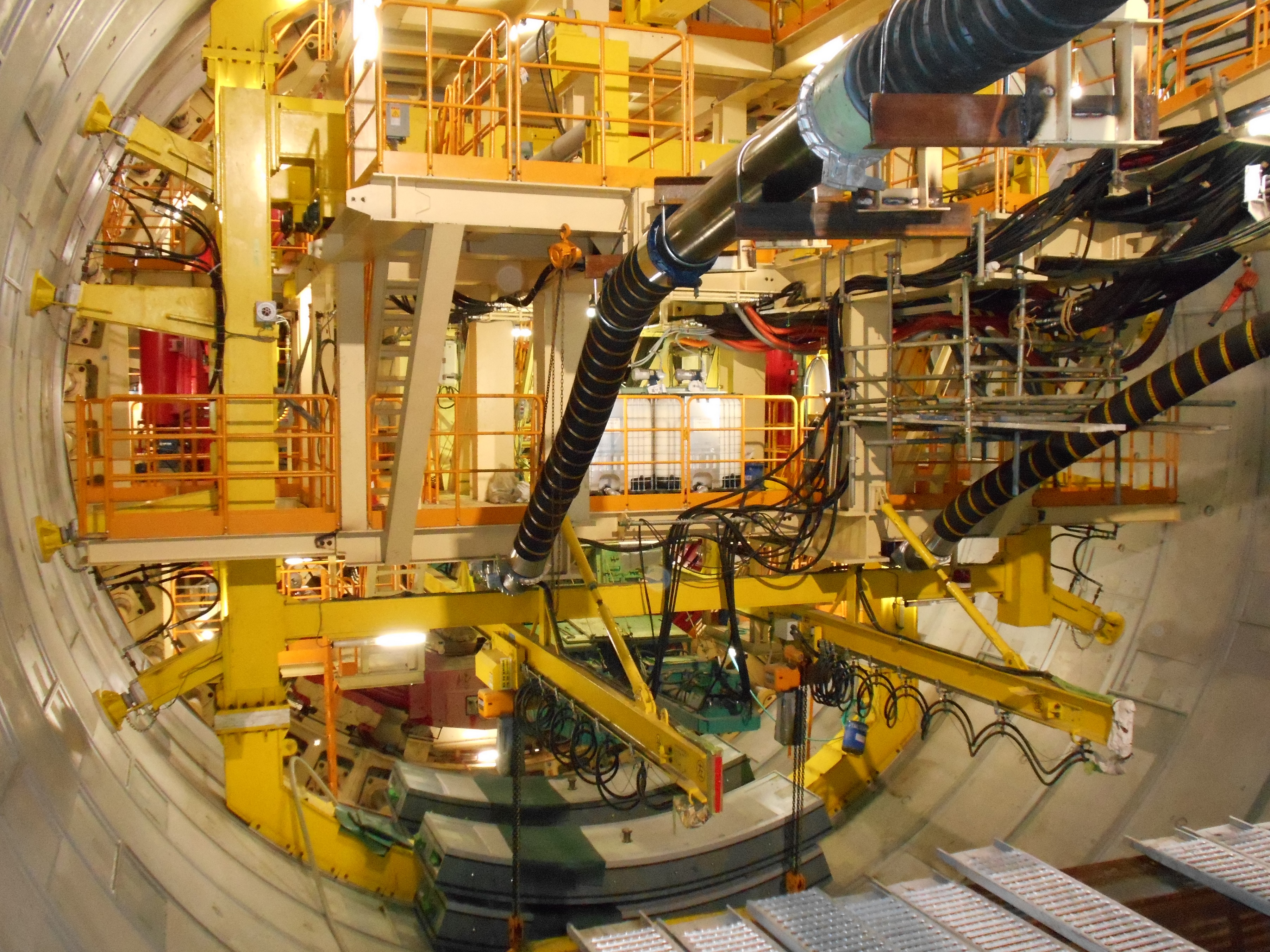 Aランプ:泥土圧式シールド工法(シールドマシン前面のカッターで掘削された土砂に加泥材を注入して、チャンバー内の撹拌翼により不透水性と塑性流動性のある泥土に変換する。シールドジャッキ推進力により泥土圧を発生させ、切羽の安定を図りながら掘進できる工法である)。地下水位が高く最小土かぶり厚が1.3mと薄いため、シールド掘進中の地表面の地盤変形と掘削トンネルの浮き上がり抑止に注意して工事が進められている。シールド掘削スピードは土質と土被りにより変化するが3m/日から9m/日である。