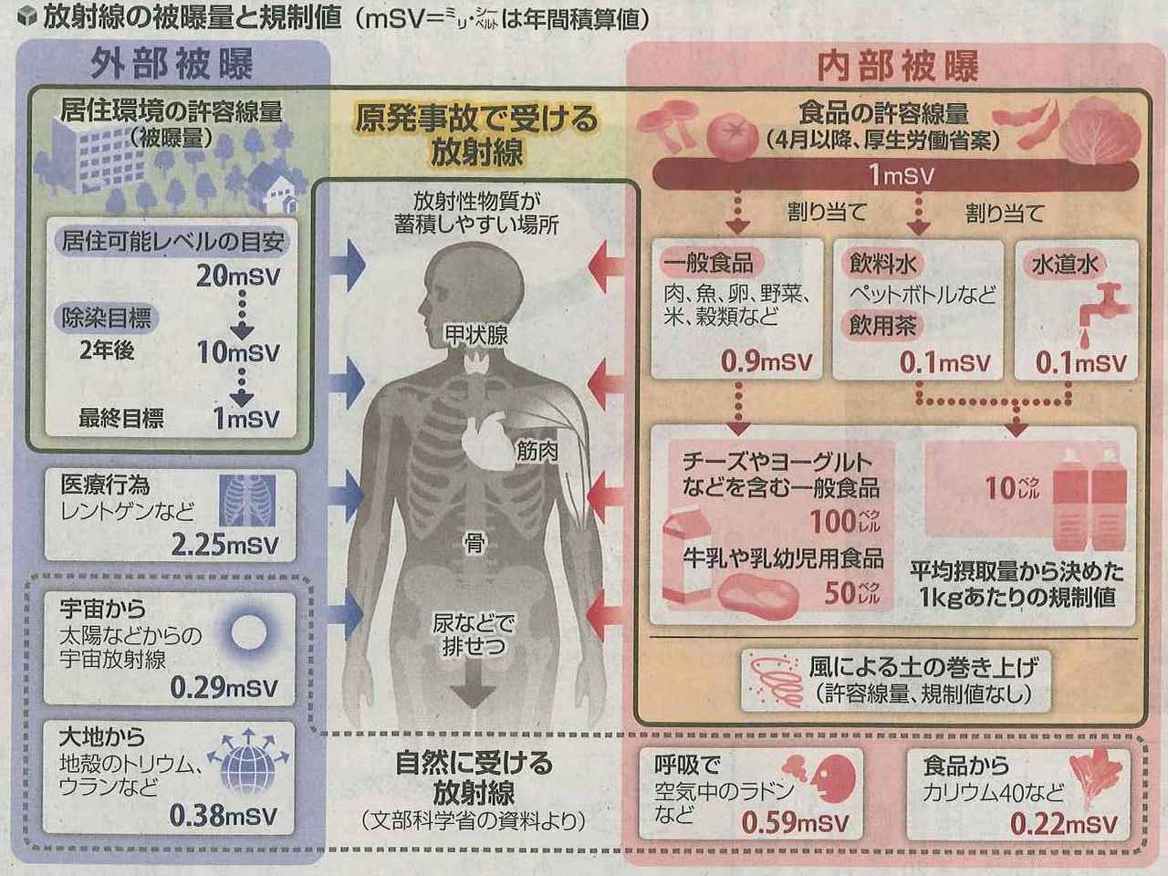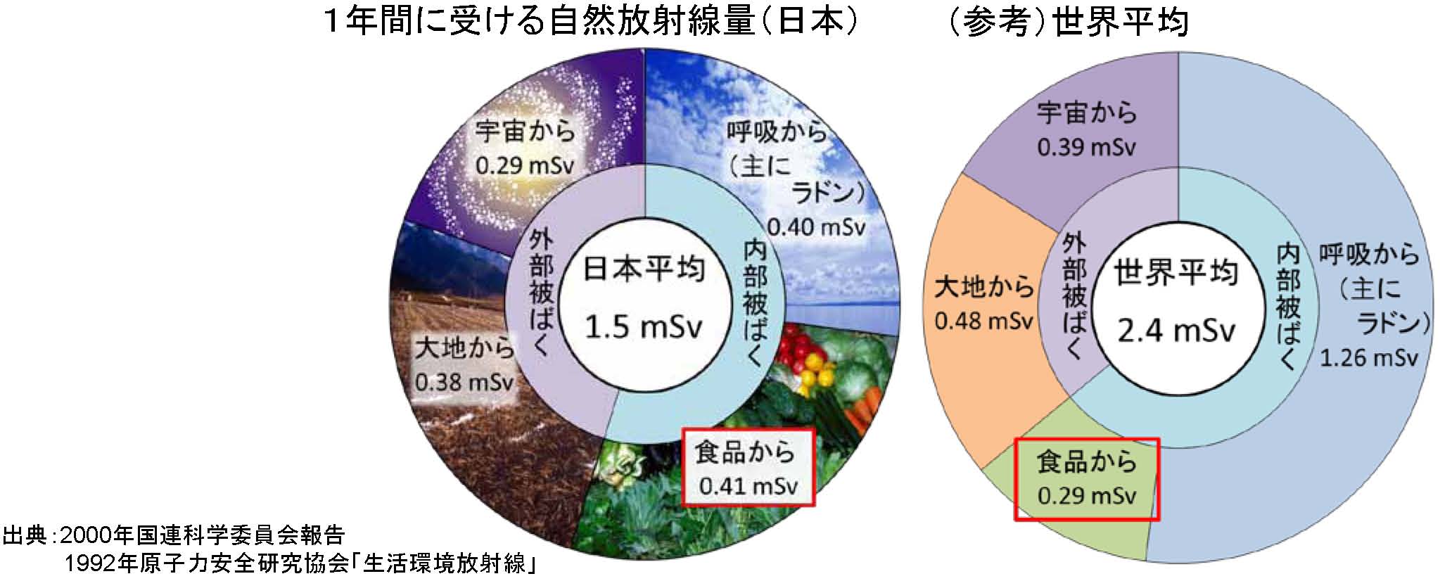 最初の図を見れば分かるように、放射能汚染がまったくなくても、空中のラドンなどから年間0.59ミリシーベルトの内部被ばくを受けている。食品に含まれる自然由来のカリウム40などからも年間0.22ミリシーベルトの内部被ばくを受けている。これらを合わせれば、無意識に年間0.8ミリシーベルト以上の内部被ばくを受けているのだ。これを気にするならば、息も出来ないし、何も食べれないことになる。