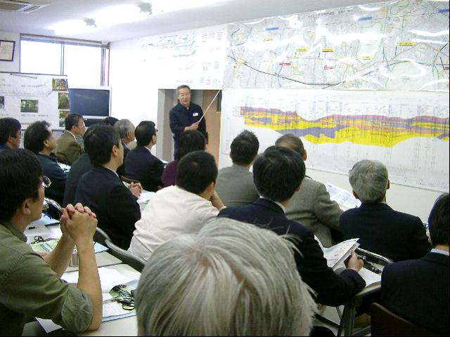 見学会は、首都高の山田川崎工事事務所長より挨拶、高速川崎縦貫線等の説明をまず受けた。続いてMMST(マルチマイクロシールドトンネル)工法についての試験施工のビデオにより、その概略の理解をした後、JVの立石所長より現在施工中の工事についての詳細な説明を受けた。その後、JV阿部所長の案内で坑内を見学、途中で、その都度説明を受けた。最後にJVの会議室に戻り、活発な質疑応答を行った。 |