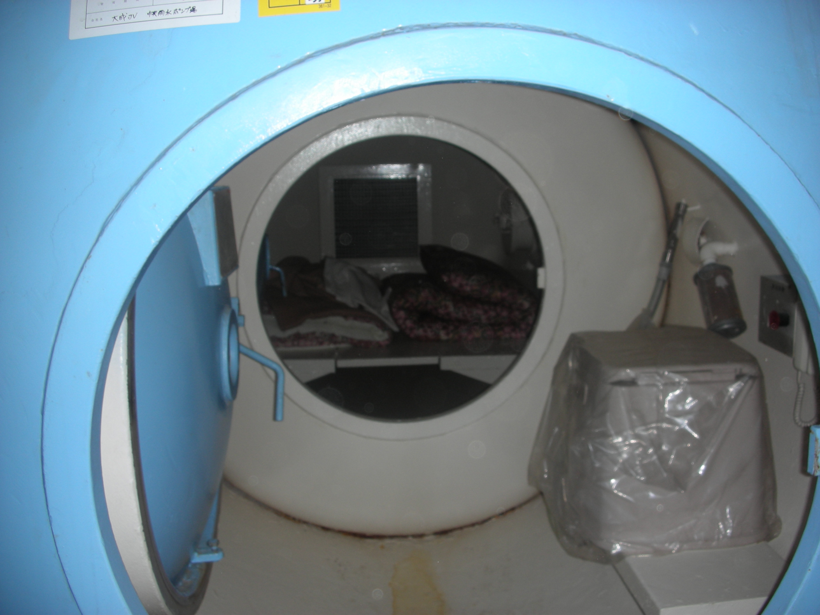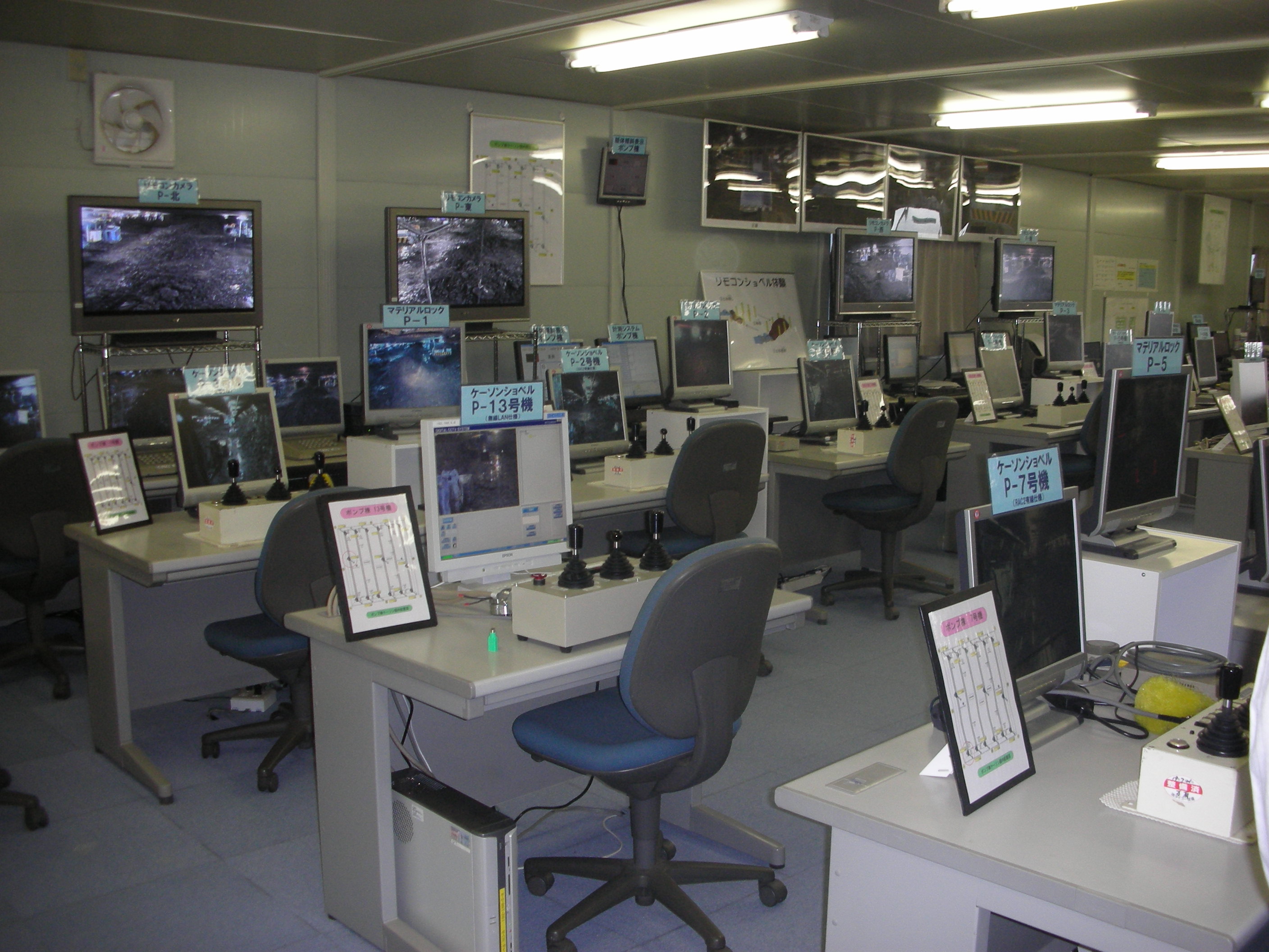 m3以上のニューマチックケーソンを近距離で同時期に2基施工することと、圧気圧0.3MPaに達した時点で、減圧症対策として酸素減圧を行うことである。また、ケーソン内が0.18MPa以上の加圧状態では、ケーソンショベルを地上より遠隔操作する無人化施工を実施している。 説明の後、質疑応答があり、ケーソン2基を近距離で施工する上での問題点、作業体制、排土の処理方法など、活発な質問がなされた。その後、現場内を視察させていただいた。主な施設は次のとおりである。 (1)ABキャリア(掘削・排土設備の一部) ケーソン内で掘削された土砂を地上まで排土する設備で、二重のロック装置により加圧状態を維持しながら施工する工夫がなされていた。 (2)遠隔操作設備 無人化施工の心臓部ともいえるところで、ゲーム感覚で操作できるような操作卓が十数台並んでいた。作業性について担当者に質問したところ、やはり有人施工に比べれば単位時間当たりの施工速度は落ちるが、長時間施工できるので最終的には施工速度が速くなるとのことであった。 (3)救急設備 ケーソン内は加圧されているため、万一、減圧症が発生した場合は緊急に治療する設備が必要である。写真−2はホスピタルロックと呼ばれる救急再圧室で、労基法に基づき5台設置されている。幸いにして、まだ使用実績がないとのことである。 (4)送気設備 本工法の特徴である圧気を作る施設であるコンプレッサー、空気清浄器などの送気設備も見学し、本工法の概要を理解することができた。 ニューマチックケーソン工法は文献等ではよく目にする工法だが、今回の参加者の方々の中でも実際に見たことがある方は意外に少なく、とても有意義な見学会であった。 最後に、貴重な時間を割いて案内して頂いた共同企業体の八浪所長、吉澤代理人に心からお礼を申し上げたいと存じます。 (播磨 進 記) 【写真-1】 遠隔操作室 【写真-2】 ホスピタルロック内部 |