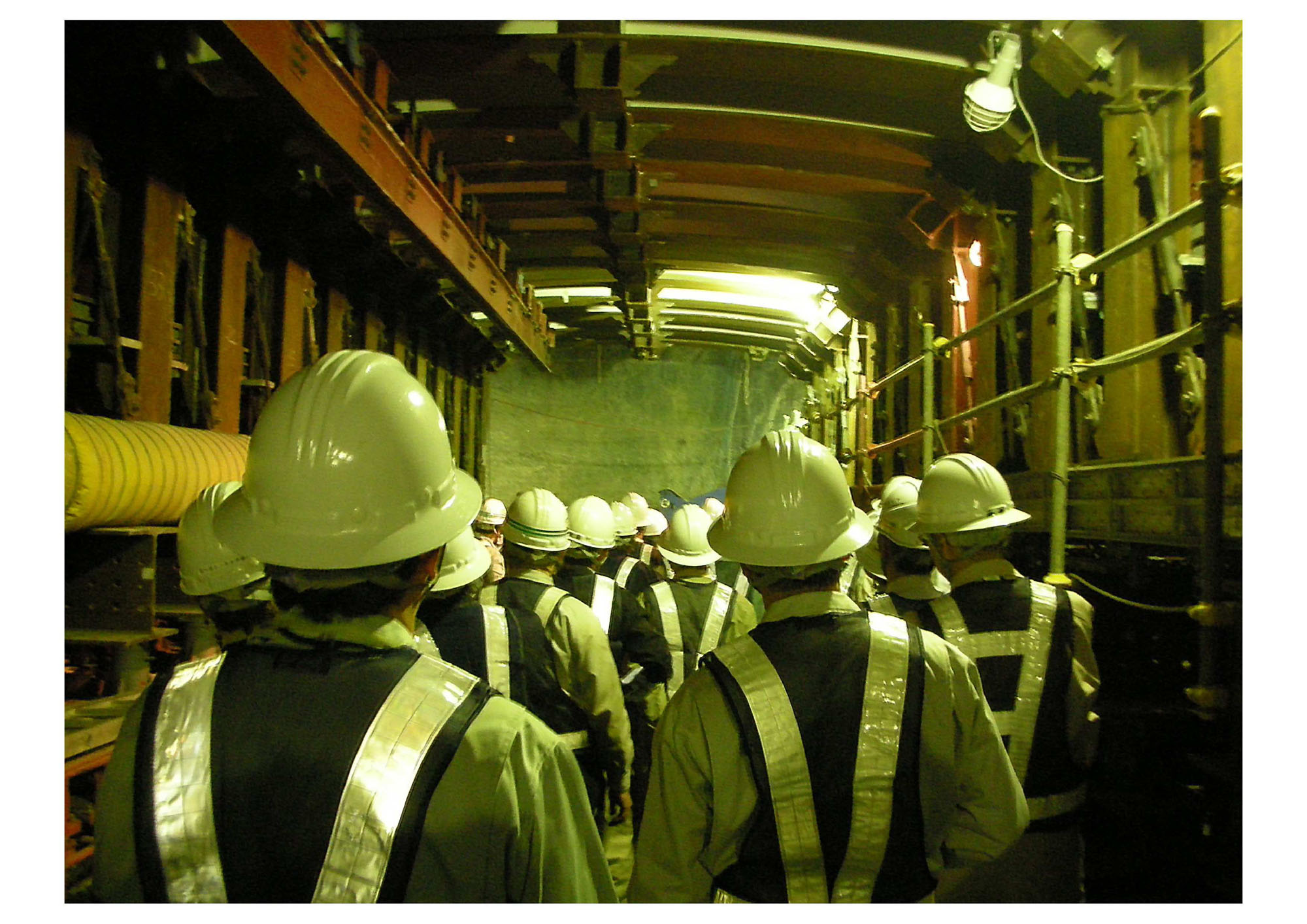 当日はやや肌寒い薄曇の天候のなか、千代田線代々木公園駅に集合し参加者29名で、首都高速中央環状新宿線富ケ谷トンネル出入口部の現場見学を行った。 最初に、大成・鹿島・鉄建 特定建設工事共同企業体富ケ谷トンネル作業所会議室において、首都高速株式会社山田所長より、首都高速の事業概要及び中央環状新宿線の路線概要について説明を受け、続いて、共同企業体深澤所長より、富ケ谷トンネル出入口の工事の特徴及び当日の見学箇所についてビデオを使用して詳細に説明をして頂いた。 本工事は、併設された2本のシールドトンネルを地上からの開削を行わずに地中で切り開き、両シールドを接続して地下出入り口を構築する工事であり、最新技術である「太径曲線パイプルーフ工法」が採用されている。非開削切開き区間の施工において、土圧及び水圧は、上部は立抗からトンネル方向に施工する直線パイプルーフで支保し、下部はシールドトンネル内からトンネル直角方向に施工する曲線パイプルーフで支保されている。 曲線パイプルーフの施工は、片側のシールドから下方に向けて発進し半径16mの円弧を描きながら反対側のシールドの鋼殻(B=1.2m)の主桁間にあらかじめ組み込まれたガラス繊維強化プラスチック部に到達させるため、鉛直方向±100mm、水平方向±50mmの施工精度が要求され、掘進機の位置計測技術と制御技術の開発で採用が可能になったとのことである。