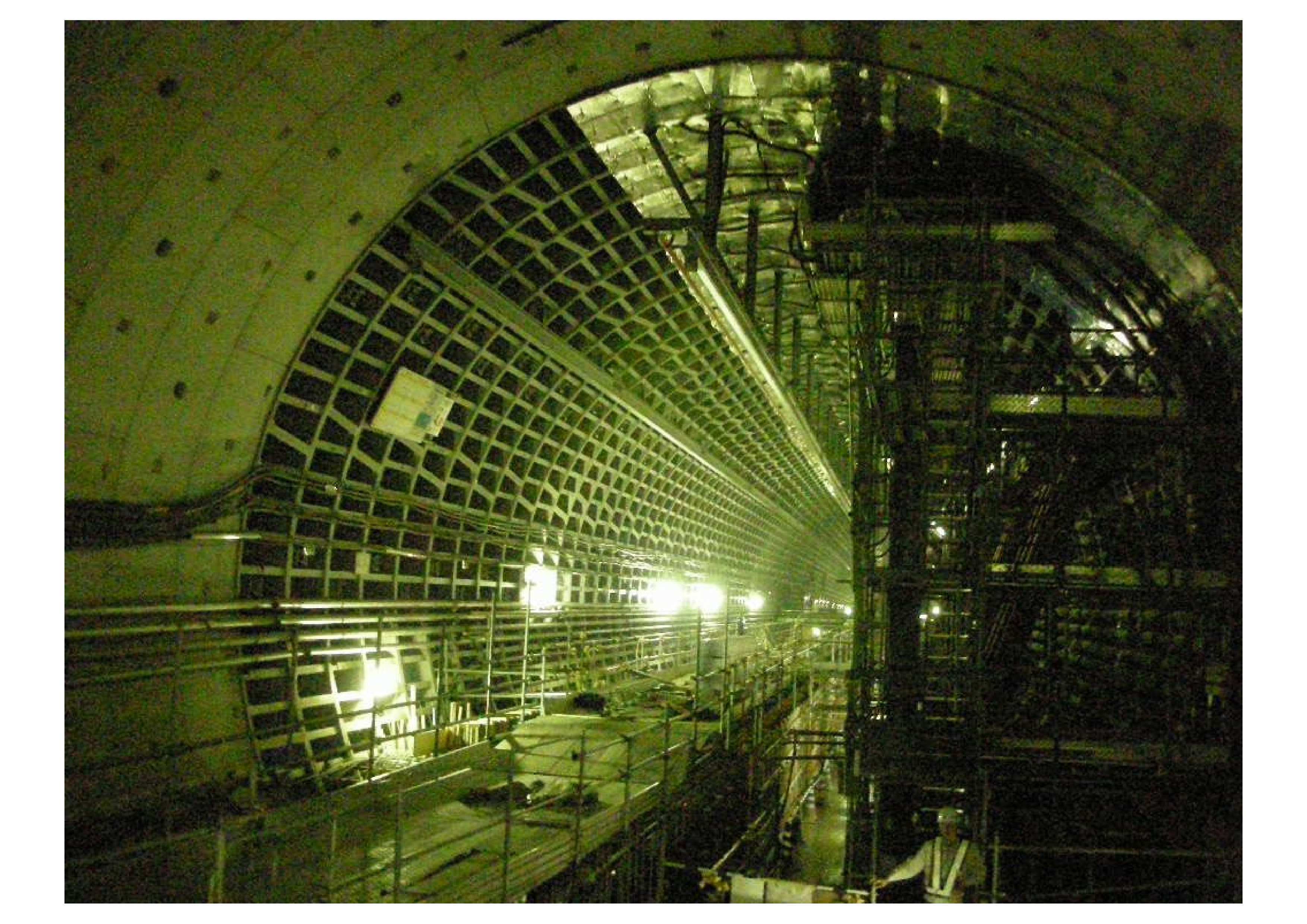 図−1 新宿側非開削区間標準断面 また、立坑部の北側(新宿側)と南側(大橋側)では、表層の地層が異なるため、地下水位低下に敏感な腐植土層が存在する北側区間は凍結工法によって止水、逆巻き工法で切開き部のRC躯体構築を行い、腐食土層がない南側区間は、薬液注入工法による止水、順巻き工法による躯体構築としているとのことで、地表(山手通り)の沈下に対して細心の対策がとられている。 現場見学は、首都高速山田所長、共同企業体深澤所長及び河本現場代理人の案内で、富ケ谷交差点の横断歩道橋より、工事区間全体を俯瞰後、切開き部切羽、立抗内上部直線パイプルーフ設置状況、シールド内支保工設置状況等について見学させて頂いた。 現場見学後、再度、作業所会議室に戻り、質疑応答の機会を与えて頂き参加者にとって有意義な見学会となった。 最後に、貴重な時間を割いて案内して頂いた首都高速株式会社山田所長、共同企業体深澤所長及び河本現場代理人に心からお礼を申し上げます。 (都出 英夫 記) 【写真-1】 切開き部切羽 【写真-2】 シールド内支保工 |