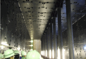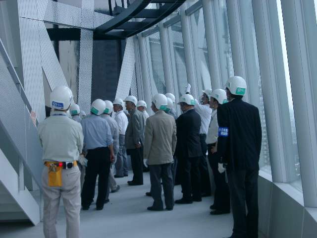 建物は六角形をしたエレベーターシャフトのコアを中心に3棟の教室が外周に配置されている。エレベーターは3層ごとに着床し、3層吹抜けのスモールアトリウムと呼ばれ空間となる。 その他の階へは階段を使って移動する。 外周部にH形鋼のブレースを配置し外からアルミパネルで隠した。これで斜めのラインができるがさらに繭らしく見せるためにガラス面に白いシールを焼き付けた。 繭の形なので中央がふくらみ上下がしぼんでいる。生産性を考慮してサッシは幅6m×3.7mの大型パネルで形状をそろえた。その代わりに曲面なので階高は均一ではなくなるが特に施工上、支障はなかった。施工図は3次元CADを駆使して作成した。 最上階、中間階、下層階と順次、案内していただき、エレベーターから外周までの距離がそれぞれ異なることで外形が繭のようなふくらみを持っていることを実感した。 階高は3.7mで比較的低いにもかかわらず天井を貼らず、床下、設備むき出しのデザインで天井が低いという印象はなかった。ただ天井を貼らない方が化粧などで返ってコスト高とのこと。 難しい仕事でありながらいろいろと工夫を重ねながら特異なデザインを現実の建物として完成させる、その技術力の高さに感心させられた見学会でした。 (高浜 良弘 記) ![]()