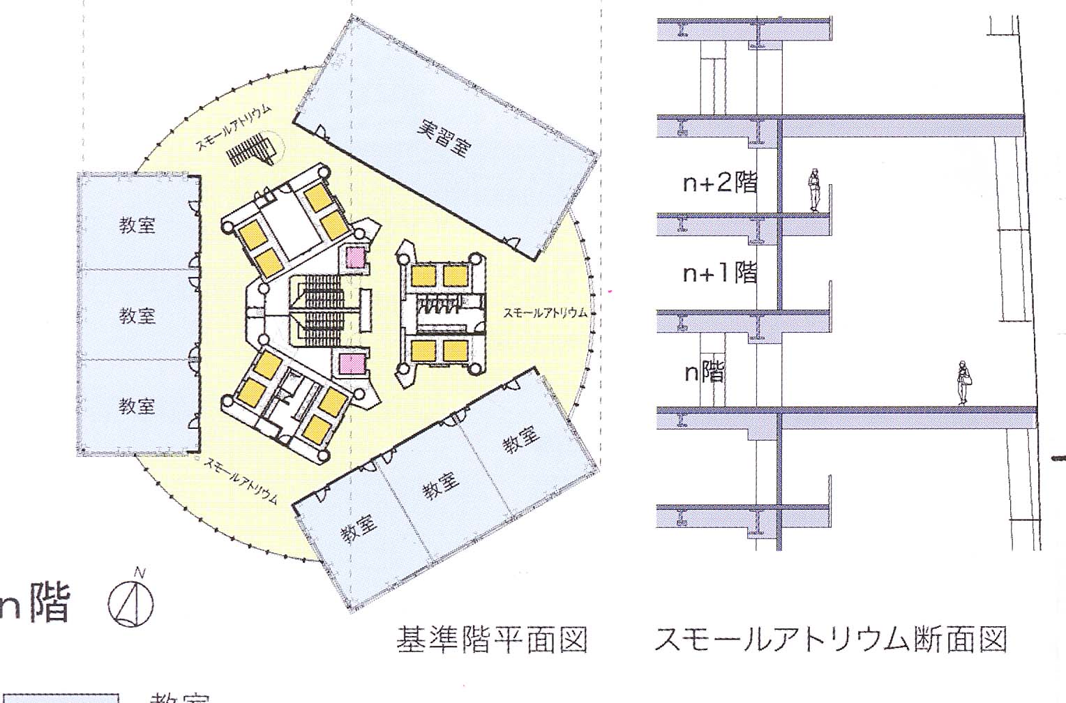 【図-1】 基準階平面・断面図 【写真-2】 見学会風景(スモールアトリウム) |