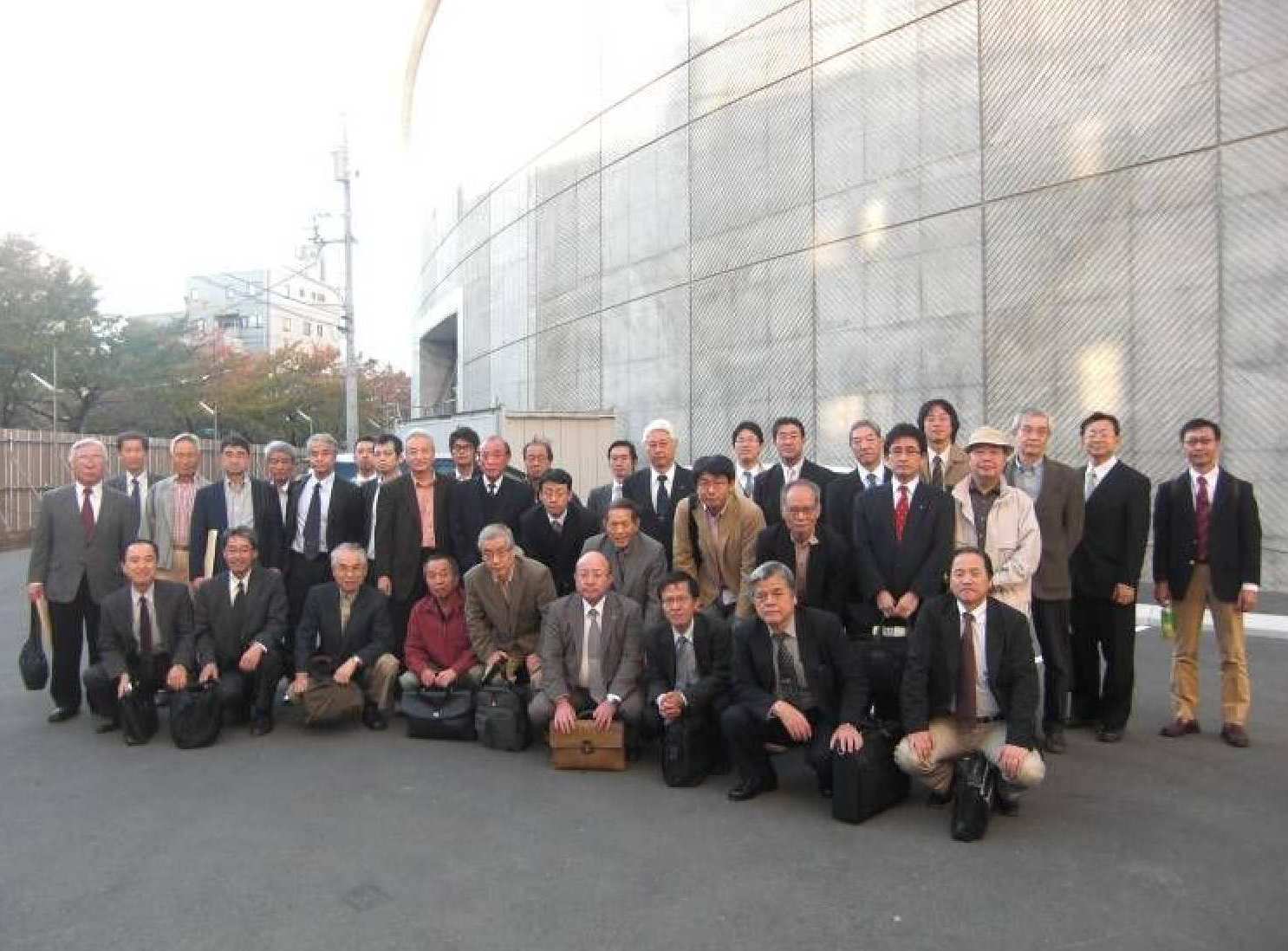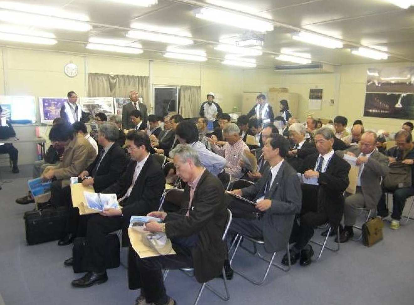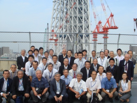 左手前方の円は、最大鉄骨φ2300mm暑さ100mmの実大模型である 3.インフォプラザ屋上からの施工状況視察 インフォプラザ屋上からの見学では、商業施設の工事から塔体の工事まで全容が眺望でき、工事の複雑さと規模の大きさを感じとることができた。 工事が進む大型商業施設にはショッピング施設のほか、ドーム型シアターや水族館なども建設される予定である。 限られた敷地内で、さまざまな工夫と綿密な計画により円滑に施工されており、現在、塔体上部にタワークレーン4基を据え施工は着々と進められている。 情報発信の拠点、観光拠点、新名所のシンボルとしての完成後の姿を想像し、低迷気味の日本のひとつの明るい兆しをこのタワーに期待し、見学会を終了した。 【写真−2】 建設が進むタワー 【写真−3】 見学参加者 (建設部会 千々岩三夫 記) |