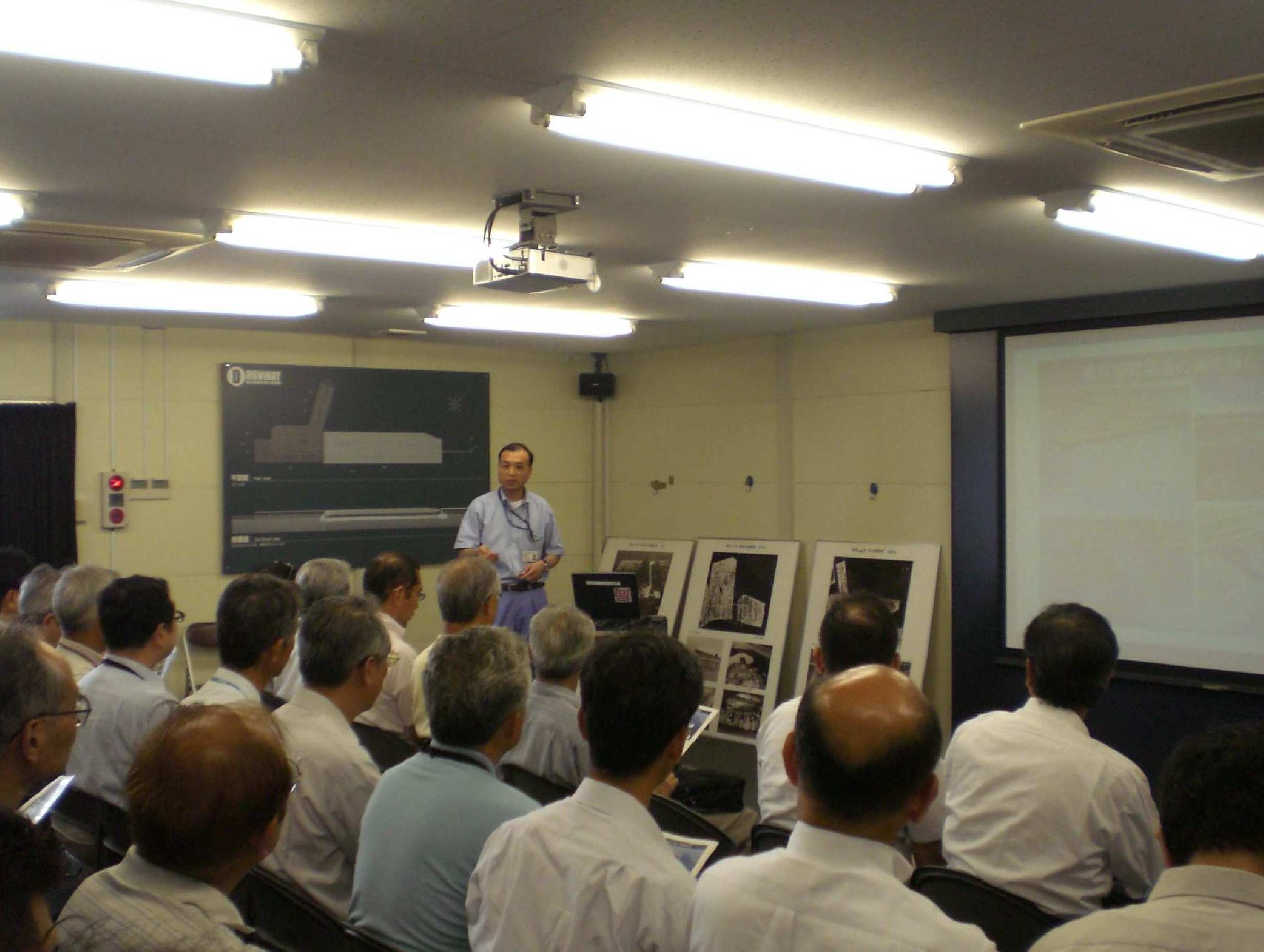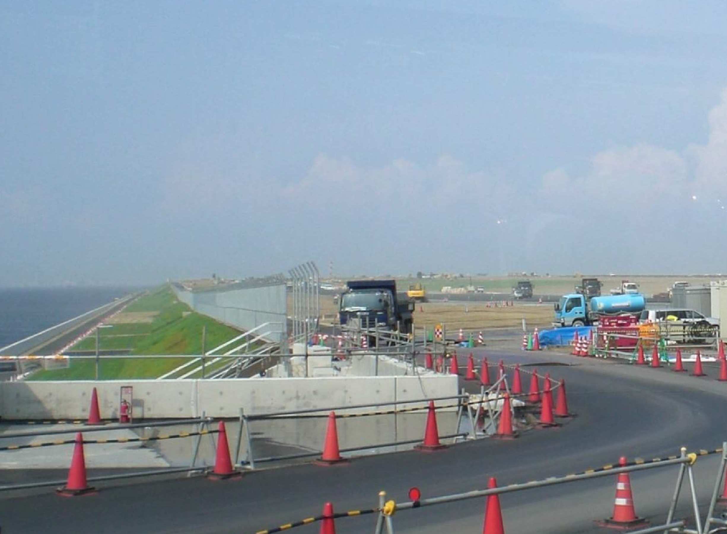 | 報 告 | 1.はじめに 羽田国際空港は、年間6,700万人が乗降する世界的規模の空港であるが、日本のハブ空港として更に発展させるため現在3本ある滑走路を更に1本増設することになり、現在の空港の南側約600Mの海上に幅425〜522M、延長3,120Mの人工島を建設、滑走路専用とすることになった。人工島は、多摩川の河口部に位置するため河川の通水性等に悪影響を及ぼさないことを考慮し河口に近い部分1,100Mを鋼管杭による桟橋タイプ、他の部分2,020Mは、地盤改良併用に依る盛土方式といった規模的には世界的に類のない特殊構造のものである。この上に4本目となるD滑走路(2,500M×60M)を設けるものである。これ等の建設について、桟橋と橋梁による連絡誘導路・連絡道路(4橋・各延長620M)を含め、3企業体とのPFI方式に依る工事が進行している。建設部会として、この拡張工事全体について、平成20年10月22日(水)に国交省東京空港整備事務所松永康男企画官に講演をお願いして勉強し、平成21年8月7日(金)には船舶により桟橋部の施工状況を海上及び桟橋上から、説明を受けつつ見学した。今回は、連絡誘導路も通行可能となり、バスを利用し最終段階になっている工事について、舗装工事・桟橋と盛土接合部工事等を主体に見学、工事全体についての技術的問題点等についても詳細に説明を受け、質疑応答の機会を与えてもらい、懇切丁寧に応えて頂き、有意義な研修となった。 【写真−1】 講演の状況2.見学状況 見学会参加者は、13:00に空港の西側に隣接した天空橋駅に集合、全員チャーターバスに乗車し、完成間近い国際ターミナルビル、新ビルに切り替えられたモノレール・旧レールの撤去状況等を車窓より確認しつつ展望台に到着、展望台2階にて拡張工事プロジェクトの説明ビデオを見、今野室長より新滑走路建設についての技術的問題点・解決策をはじめ拡張工事全体の説明を受け、質疑応答をまず行った。深い軟弱沖積層、河口地域等の多くの難問題に対応して、100年以上問題なく大丈夫な滑走路として供する、桟橋・盛土複合型(ハイブリッド方式)人工島、桟橋・橋梁方式の連絡誘導路等をいかに計画、設計、施工をしたかについて説明を受けた。特に、平成20年10月の講演会で主要な技術的問題点として話された、鋼管杭の腐食、盛土の沈下・法面の耐震性、桟橋と盛土接合部の地震時の問題 の3つの事項について、今回その後の施工フォローを含めた詳細な説明を受けた。