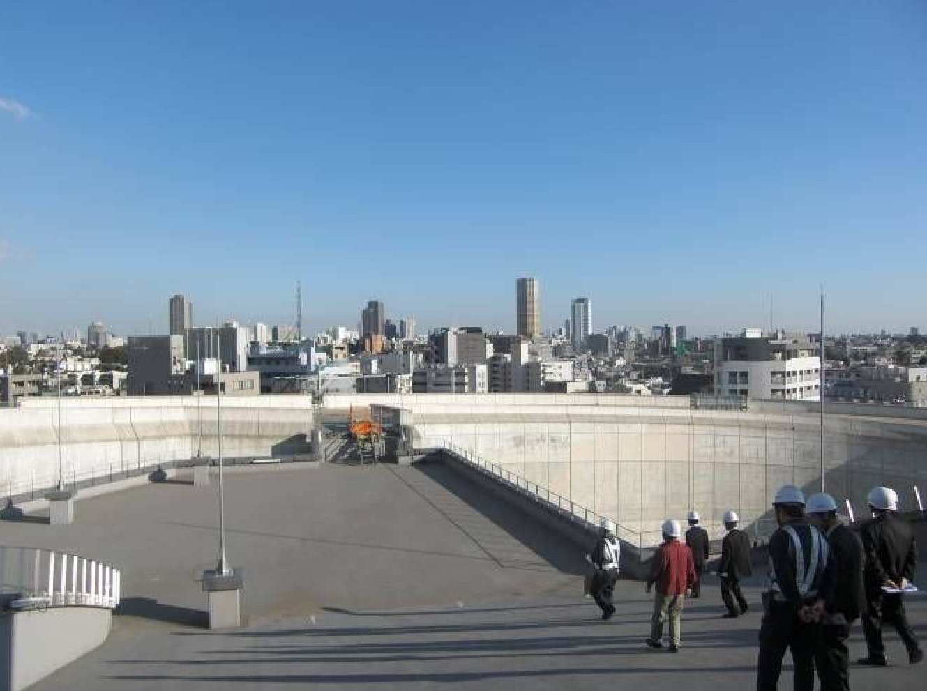 ![]() 【写真−1】 佐伯所長による概要説明 【写真−2】講演会場 【大橋連結路工事】 連結路工事は、山手通りの支線に開削部を設けて、その先端からシールド工法により連結路を構築し、その後に大井方向からの本線シールドトンネル間を地中で切り開いて分合流部を構築する計画との説明であった。シールドは、上層と下層の2本のトンネルを1台で掘進する工法を採用しているとのことである。 ![]() 【写真−3】大橋ジャンクション屋上 【写真−4】大橋連結路に使用されるシールドマシン 3.おわりに 今回の見学会は、首都圏における大規模な都市土木の現場ということで、周辺環境の保全を図りながら工事を遂行するということで貴重な見学会でした。 工事説明ならびに現場立会い等に携わっていただいた首都高速道路(株)ならびに工事関係者の方々に感謝いたします。 ![]() 【写真−5】見学会参加者 (鈴木 久尚 記) |