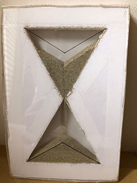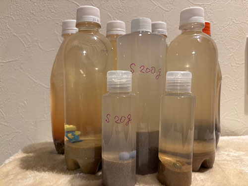 理科実験の模型造りは、後述する理科教室で用いるために空き時間に試行錯誤しています。自分で作製したのは砂時計と液状化模型1)の2つのみですが、砂は産地などで特徴が異なるため、様々なバリエーションを造ることが可能です。砂時計は単に時間を計測するだけでなく、その動きを観察すると安息角という斜面などのある一定の勾配を見ることができます。理科教室の時には砂時計の製作のほか、砂山を造ってそこに霧吹きなどで水をかけ続けるとその山がどのように崩れていくのか観察することで防災に対する意識づけも行ってきました。また、液状化の模型については昨年開催されたイベントでの際に教えていただいた方法でペットボトルや100円ショップで販売されている容器を用いて複数の模型を作製しました。今後、独自にバリエーションを考案していきたいと思います。