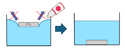 また、石けん(せっけん)液(えき)(界面(かいめん)活性剤(かっせいざい))などを入(い)れると、水(みず)分子(ぶんし)の引き合(ひきあ)うチカラが弱(よわ)まり、一円(いちえん)玉(だま)は沈(しず)みます。