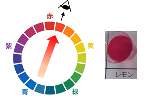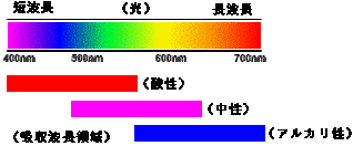 酸性(さんせい)の時は、青を吸収(きゅうしゅう)するので赤く見える