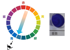 アルカリ性の時は、赤を吸収(きゅうしゅう)するので青に見える