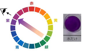 そして、中性の時は、緑を吸収(きゅうしゅう)するので紫に見える